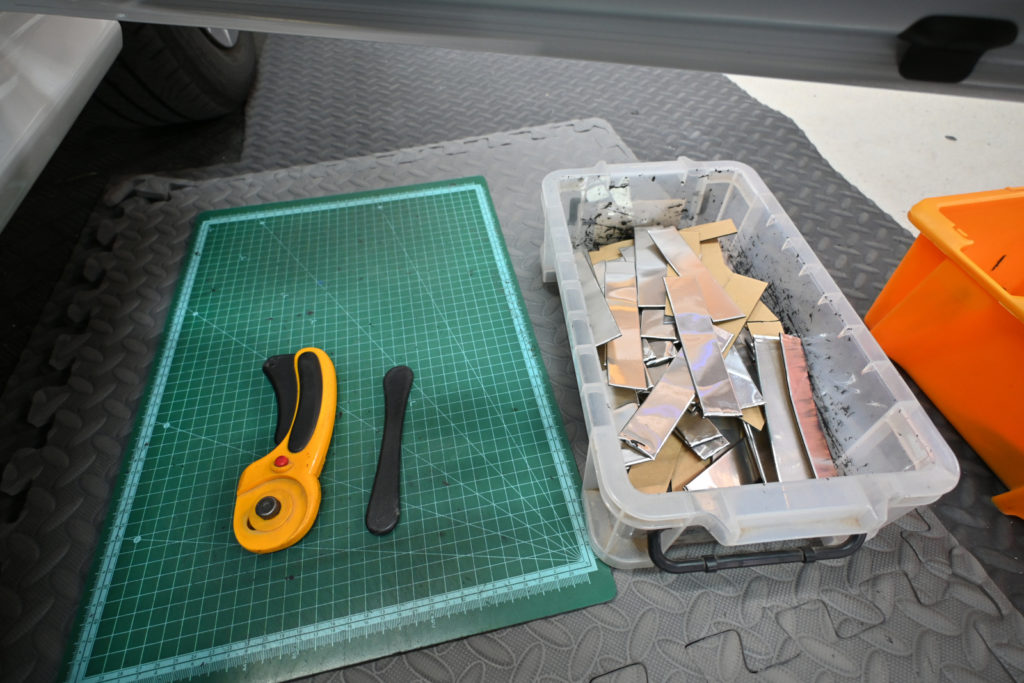 あえて適当な大きさにカットしてある制振材の中から最適な大きさのものを選んでポイント部分に貼り付けます。