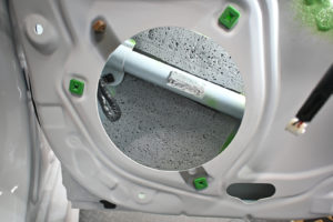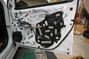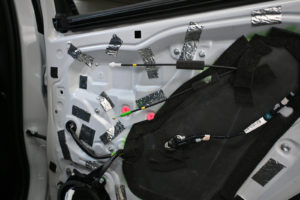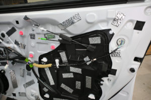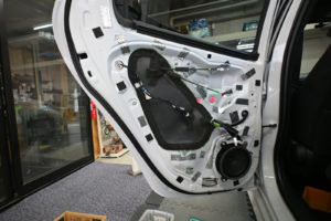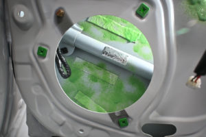ドア内部を丁寧に脱脂処理後、指先でアウターパネル裏をコンコンと叩きながら制振材を貼り付けるポイントを探ります。