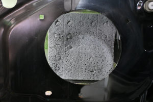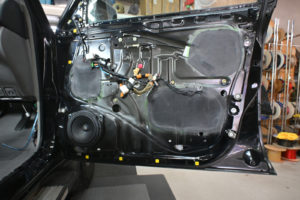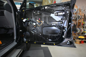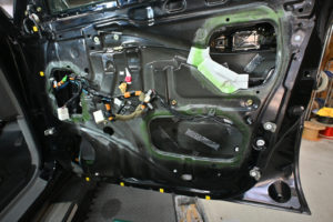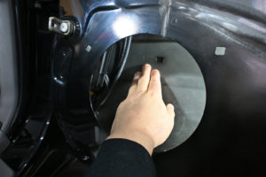 ドア内部を丁寧に脱脂処理後、指先でアウターパネル裏をコンコンと叩きながら制振材を貼るポイントを探ります。