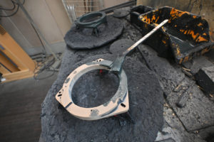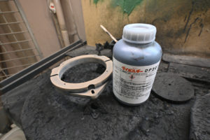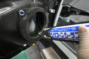 サービスホールの縁に耐熱ボンドを吹き付けて粘着を強化してサービスホールを塞ぎます。